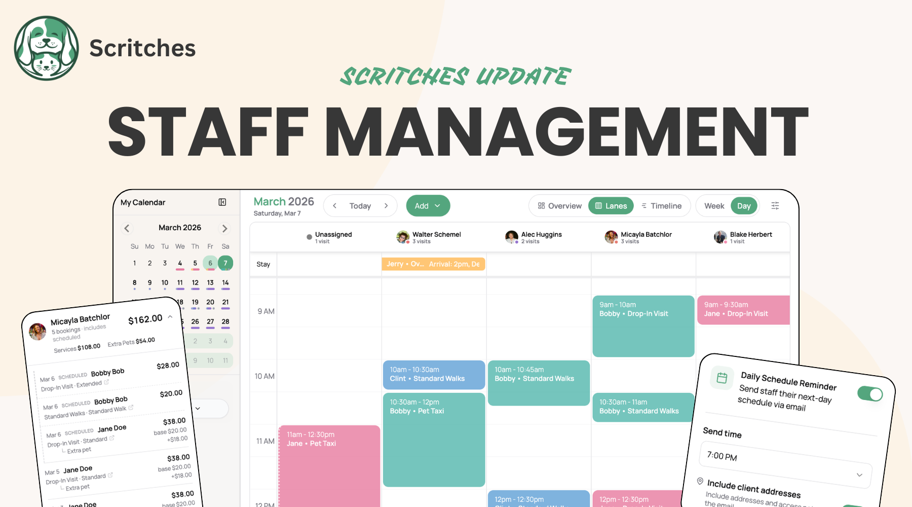 The new Staff Management system gives you the tools to run and grow a real team inside Scritches.